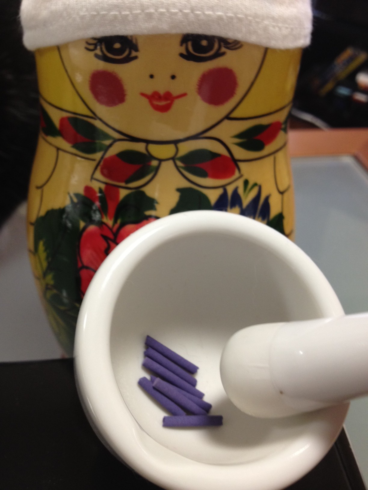 お香を1本、細かく折って乳鉢に入れて、ごーりごりします。