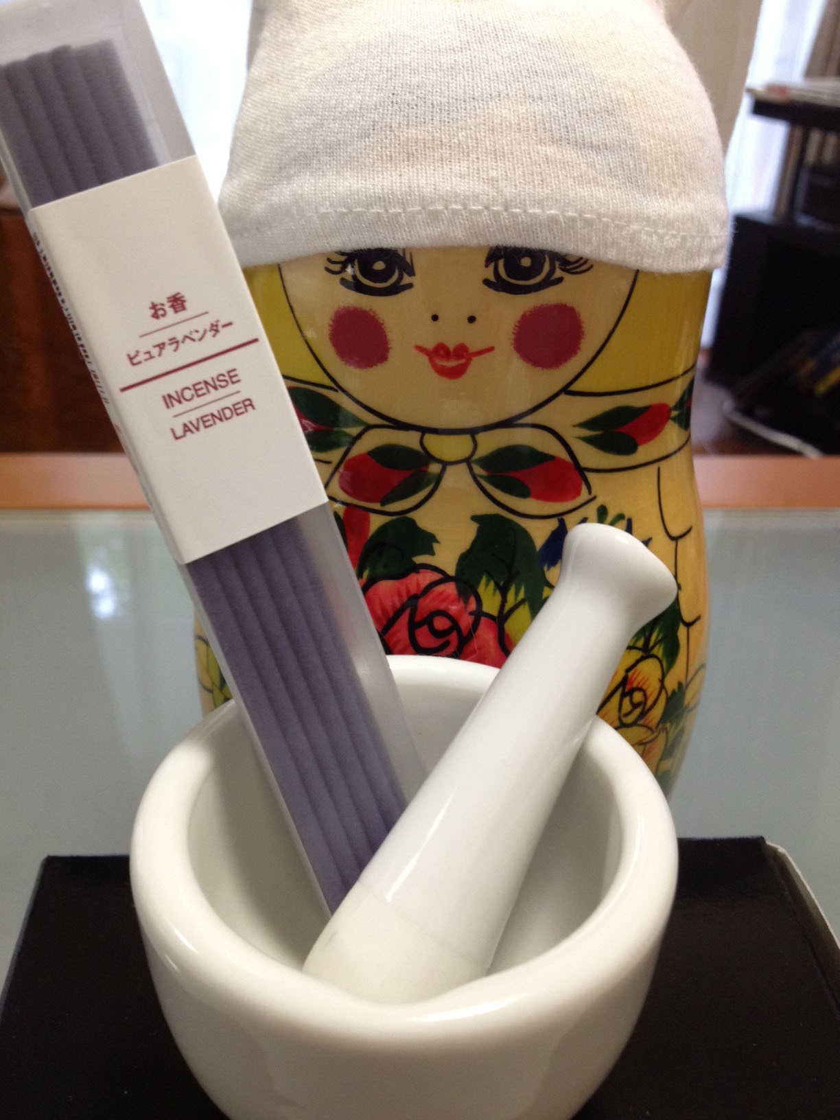 ・ お香をつぶす何か(グルコは張り切って小さな乳鉢をハンズで630円で買った!)